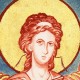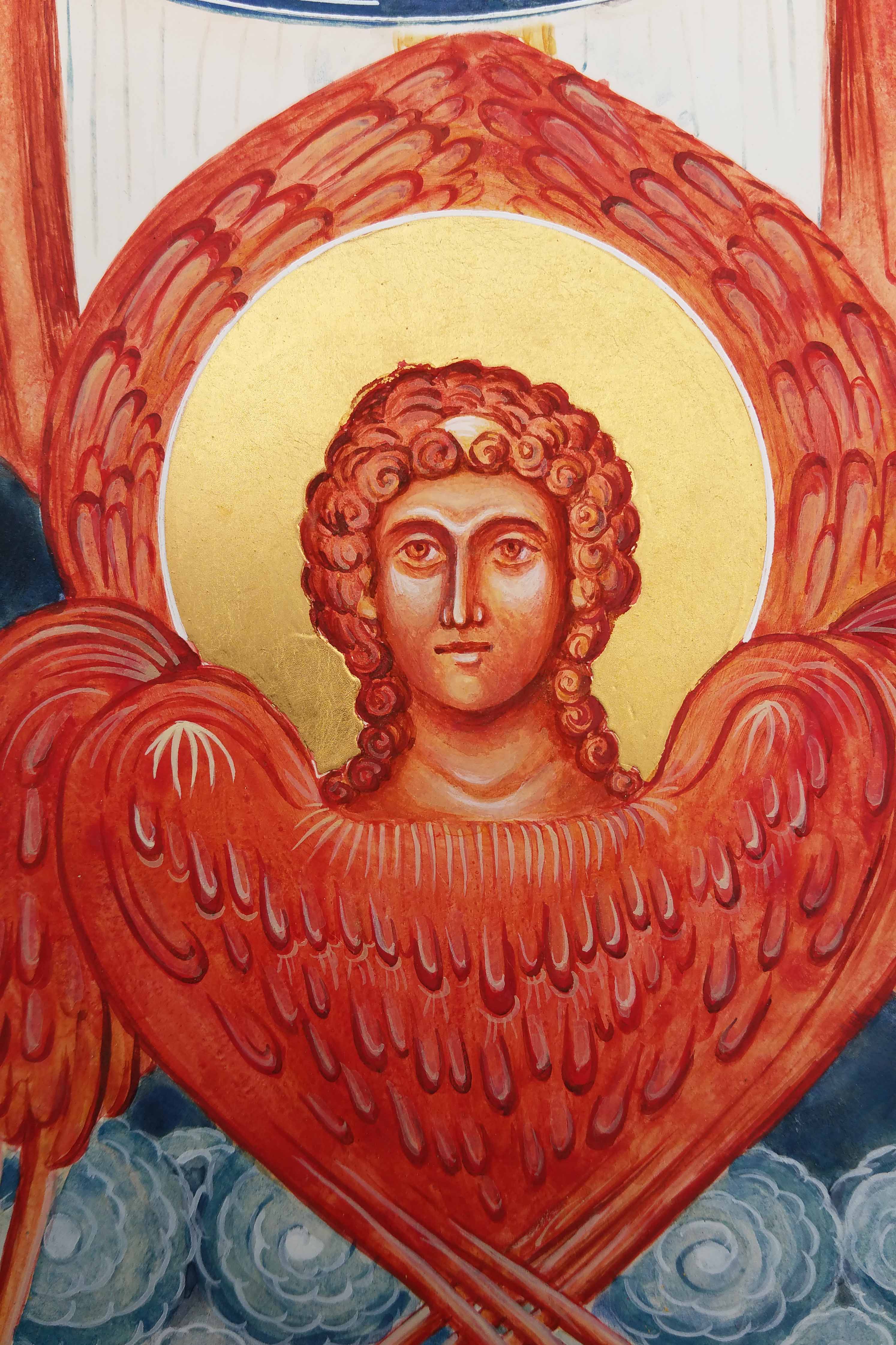I painted the wings in thin layers of Vermilion and Italian Gold ochre. This reflects the sphere of red-gold surrounding the Christ child. There are many yellow ochres – any of the brighter ones will work.