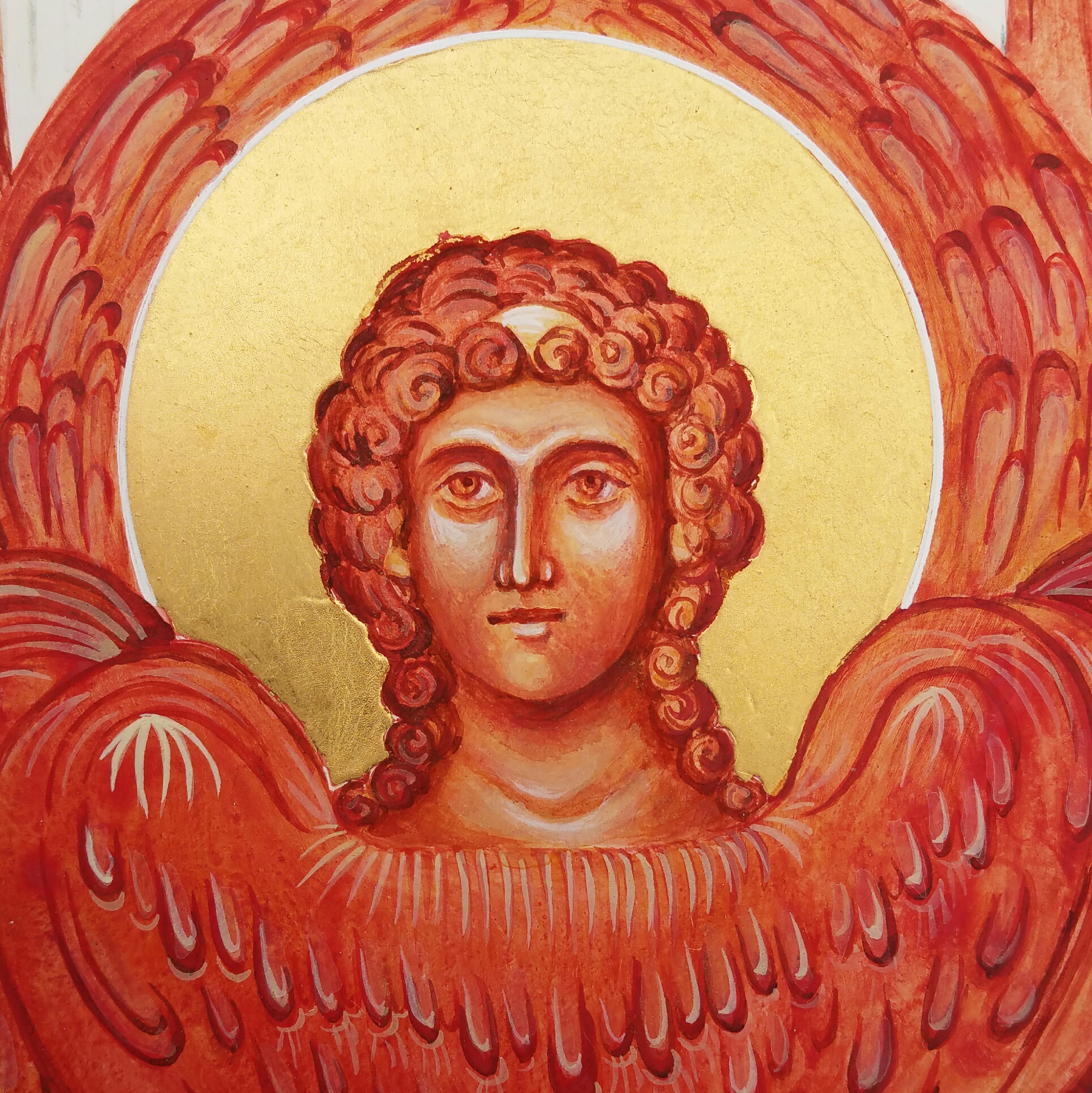 With the swirling clouds in place, I moved on to the central part of the icon of the Council of Archangel Michael and the red winged Cherub below. I’m going to zoom close up on what is quite a small face – about 2cm diameter.
