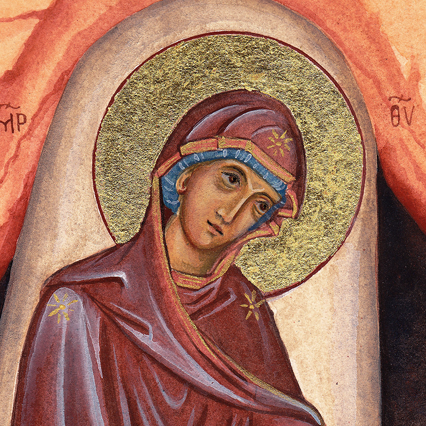 It was somewhere during this exploration stage that I came across the translucently beautiful work of the Romanian master iconographer Gabriel Toma Chituc. This detail from his Nativity icon was an answered prayer for me as it expressed so eloquently the union of heaven and earth, Mary placed vertically and the Christ Child horizontal with the light of the star reaching into the cave.