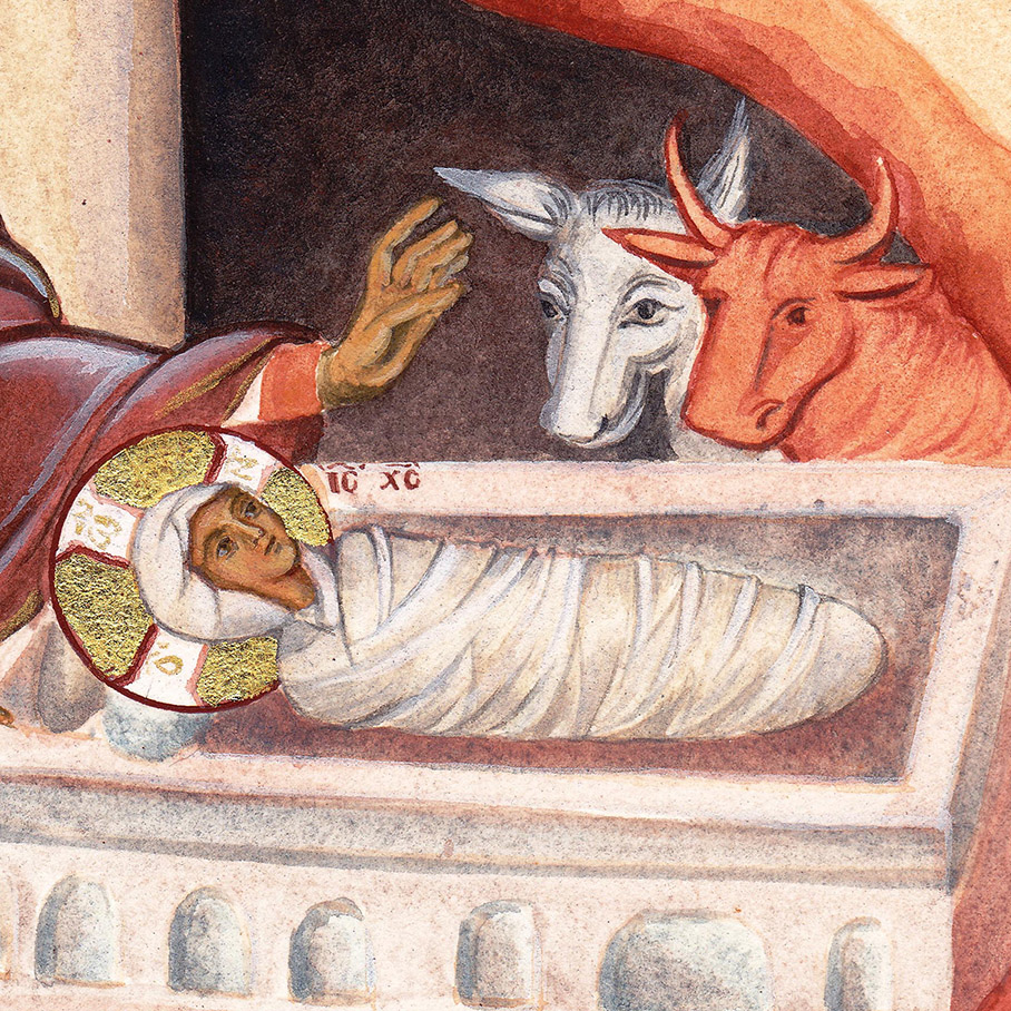 We were encouraged to study good examples of our chosen festal icon referring to frescos and manuscripts. At first, the variety of prototypes felt overwhelming (just google ‘orthodox nativity icon‘) but I have a particular love of manuscripts and one in particular spoke to me with its beautiful simplicity – the Armenian Nativity by Toros Roslin, painted in the 13th century, so much so that I painted a reproduction on vellum (blog post here).