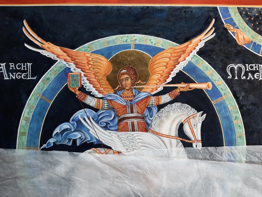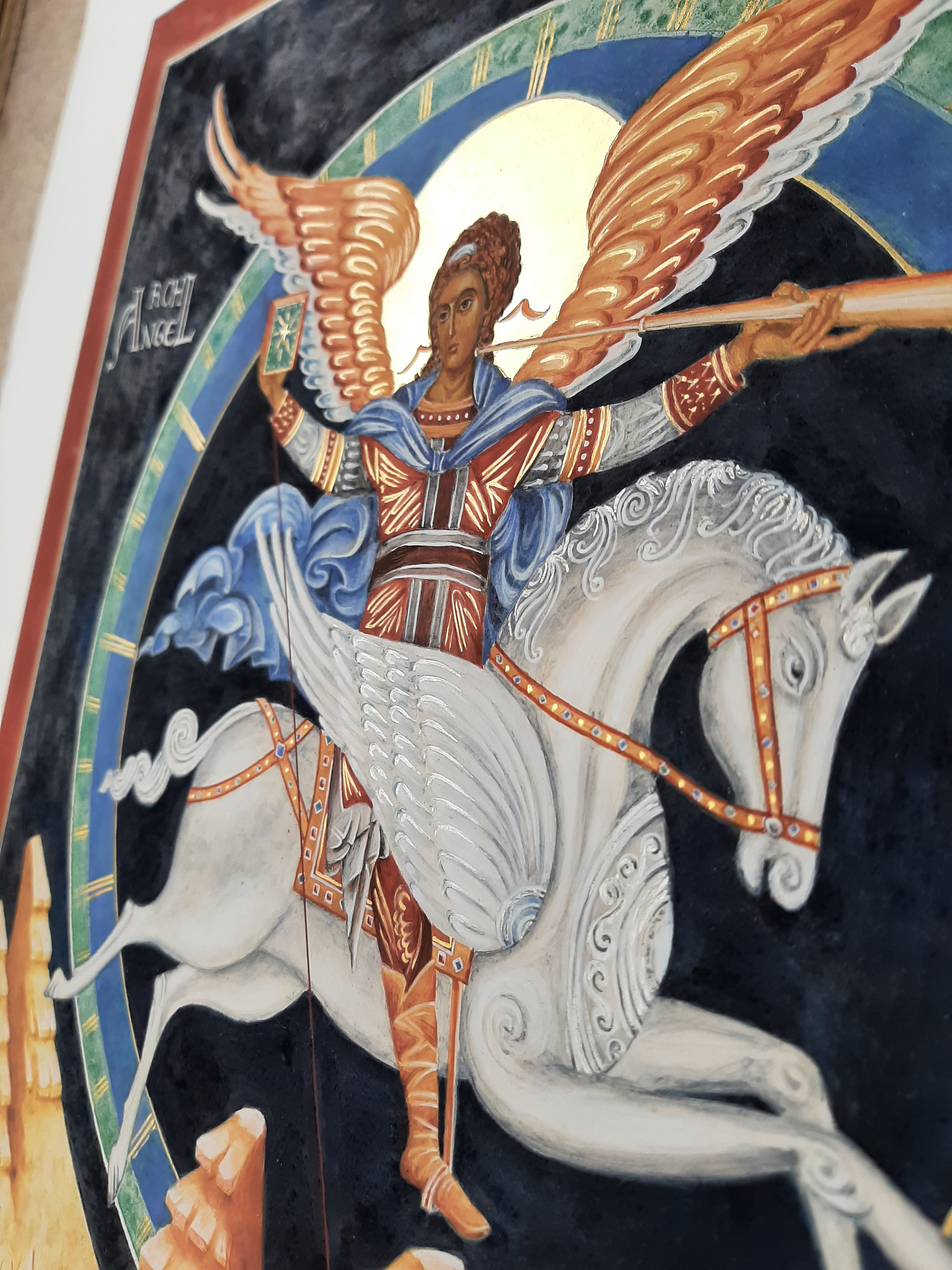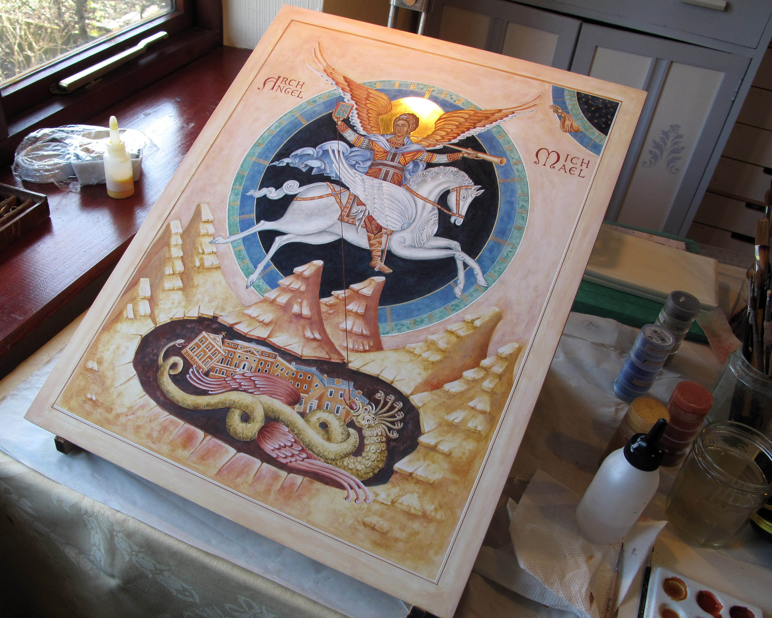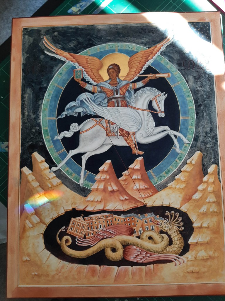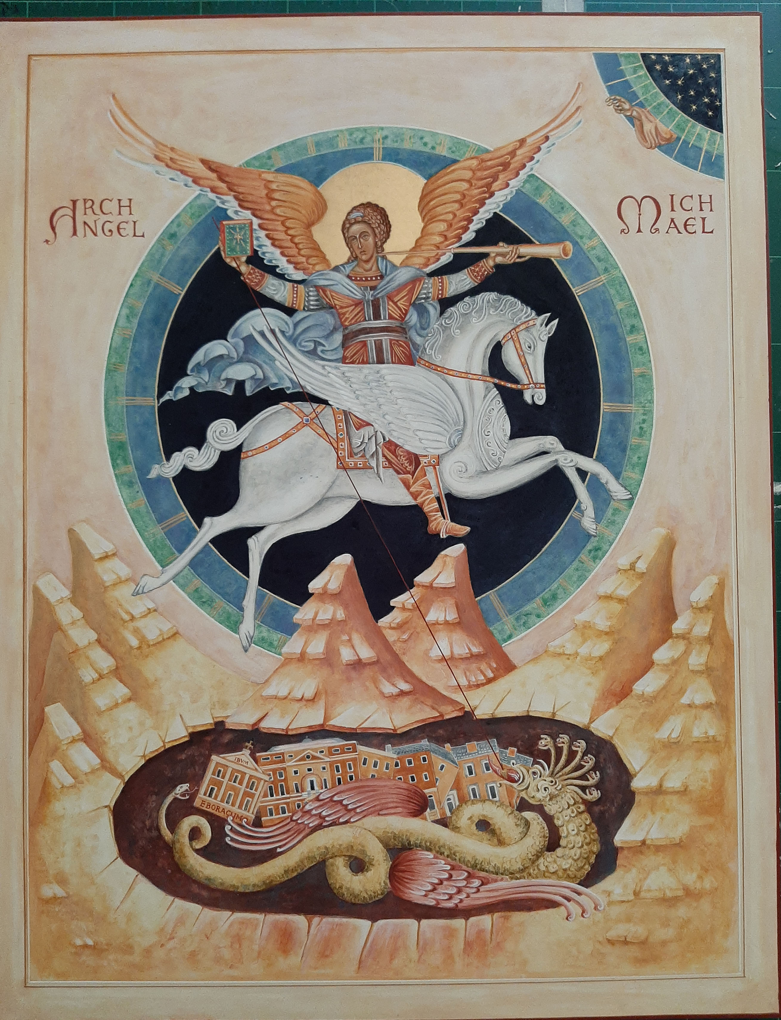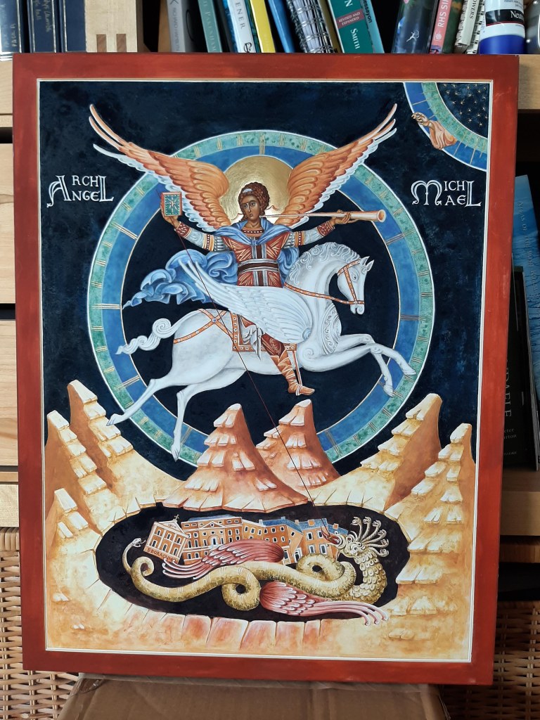 At the time, I was happy with the composition, content and colours of this icon of Archangel Michael. It was one I had given a lot of thought to – I wanted to paint an icon to show the story of how many centuries ago, the sisters in the Bar Convent, York, had called upon Archangel Michael’s help during a mob riot and their small community was under threat. The Archangel appeared on the roof of the convent – astride a white horse – and the mob fled.