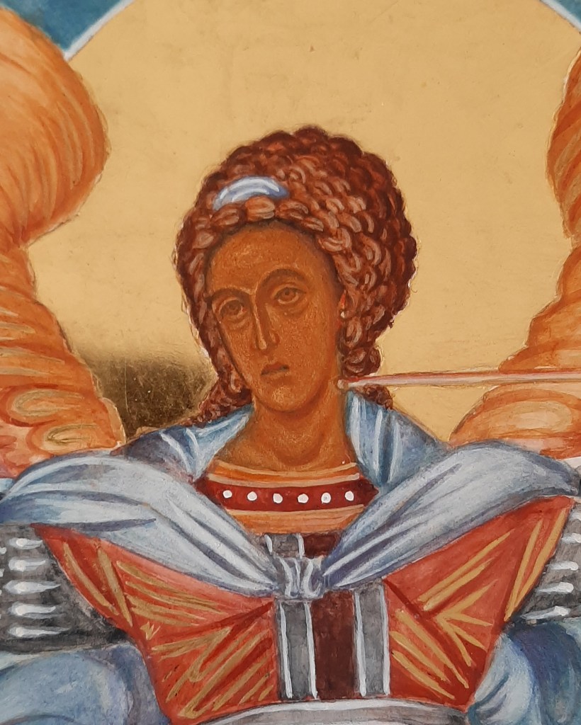 I’m looking back on the process of painting this icon of Archangel Michael (9.5 x 7” on 1” birch ply) looking in particular at the face painting stages with a summary of the earlier steps.