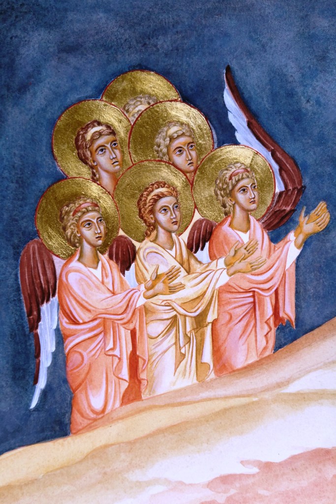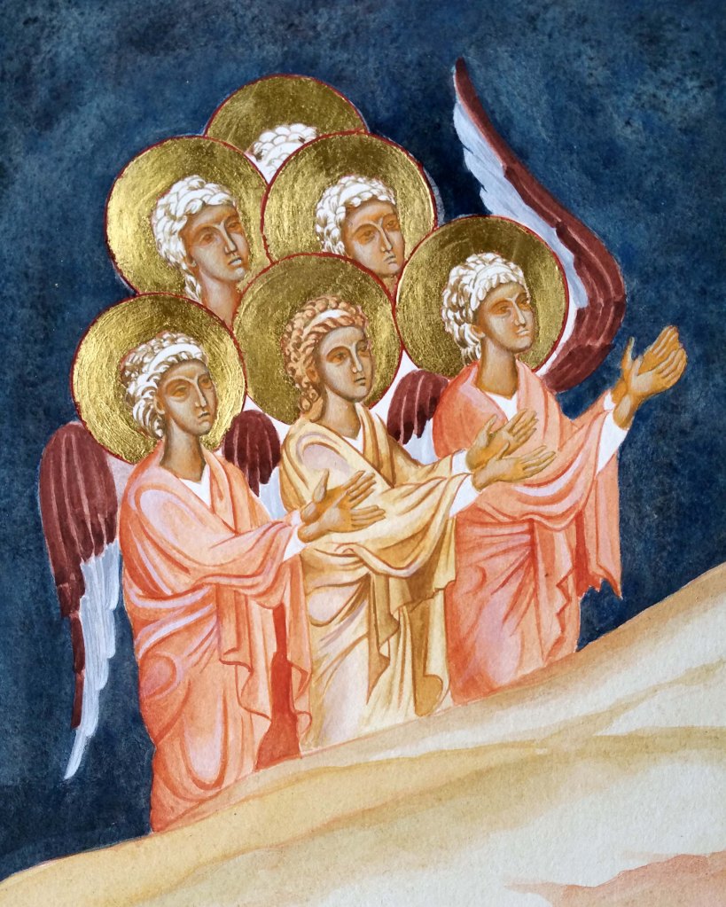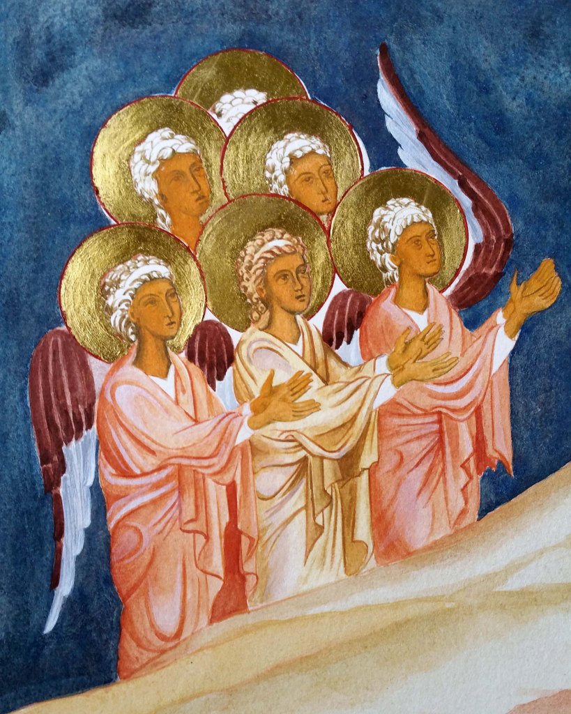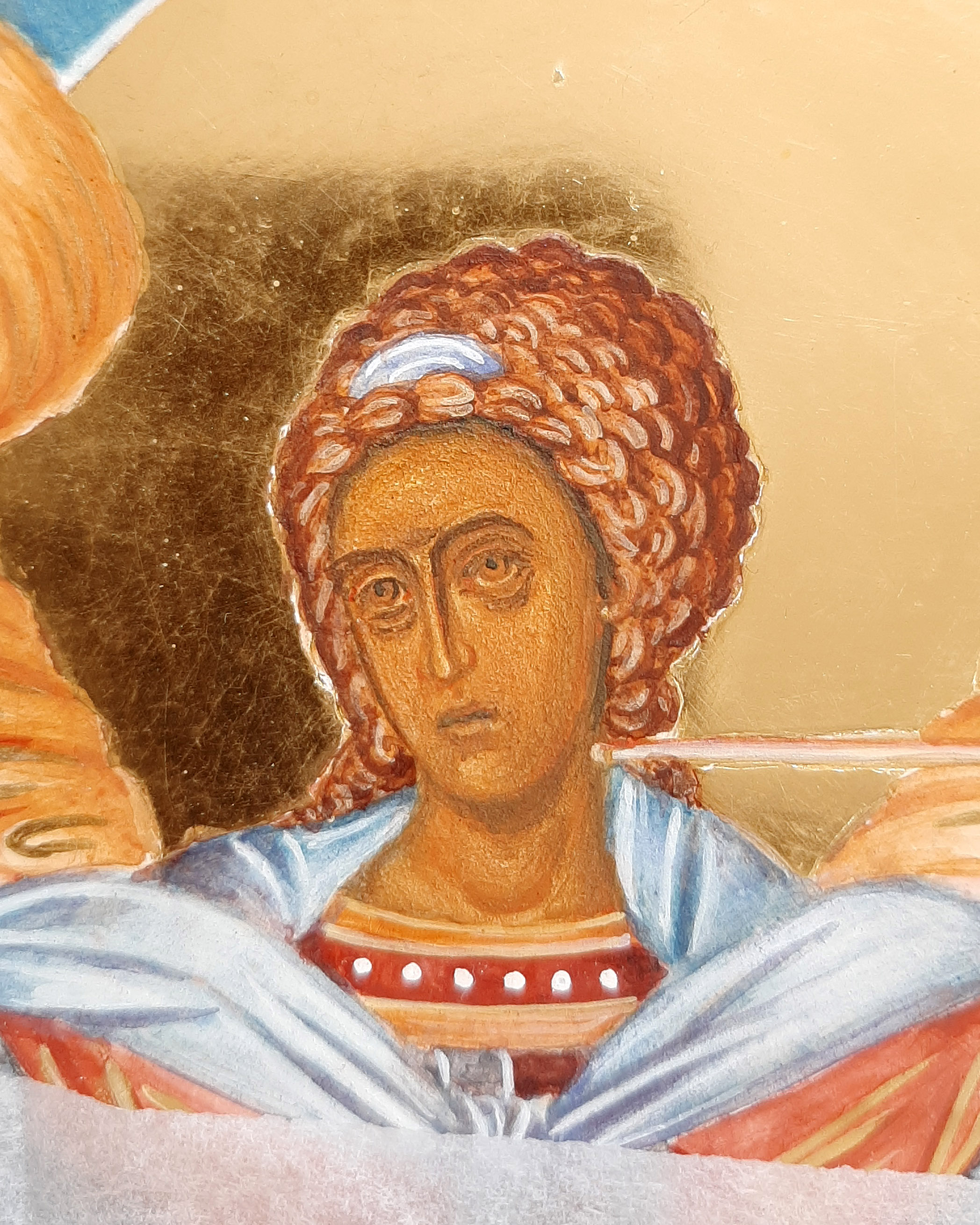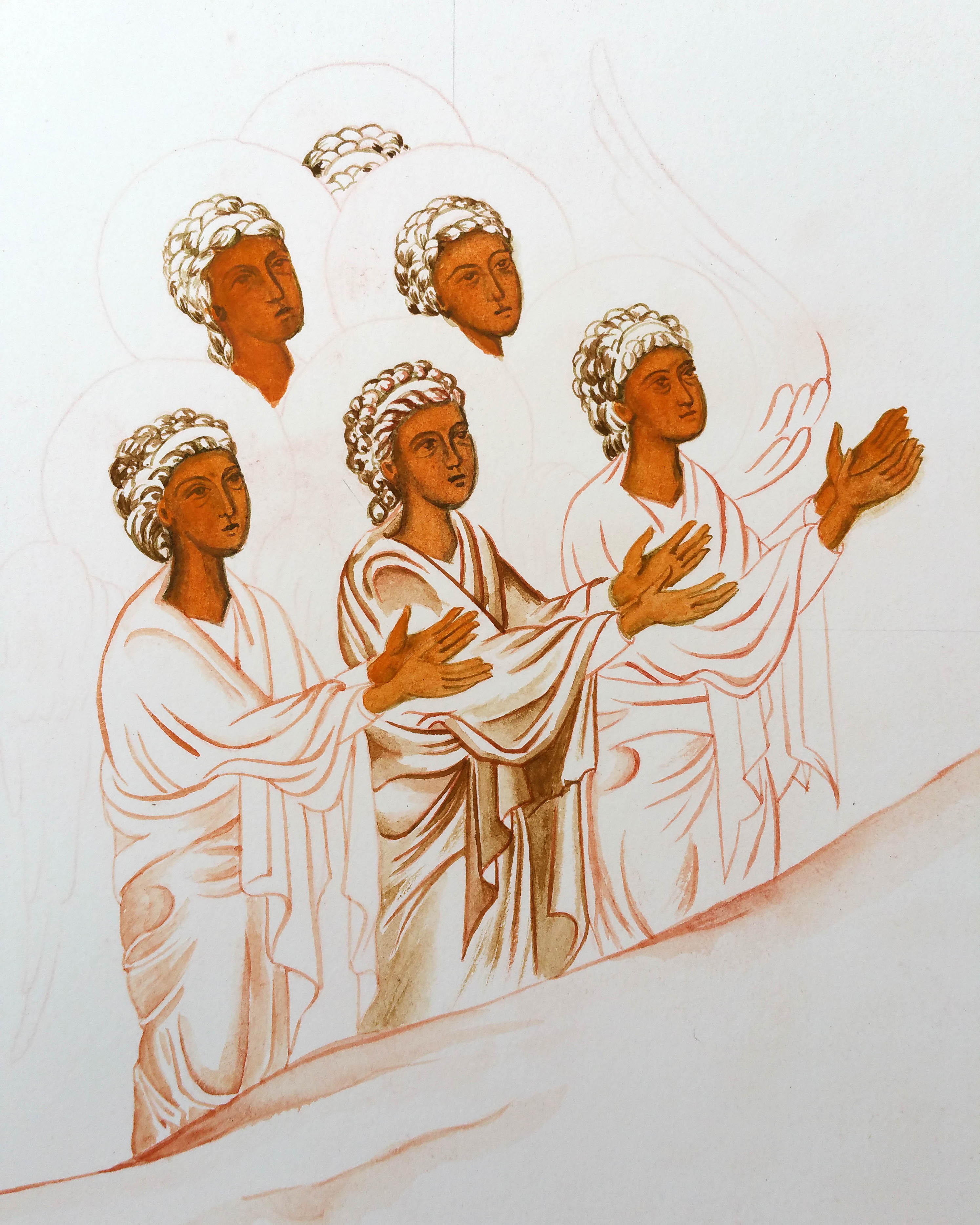 To follow on from the last blog post, I’d like to look at the stages of painting the angel faces. There’s a lot of them! The prototype that I’m referring to is a 19th century Russian icon The faces are captivating.