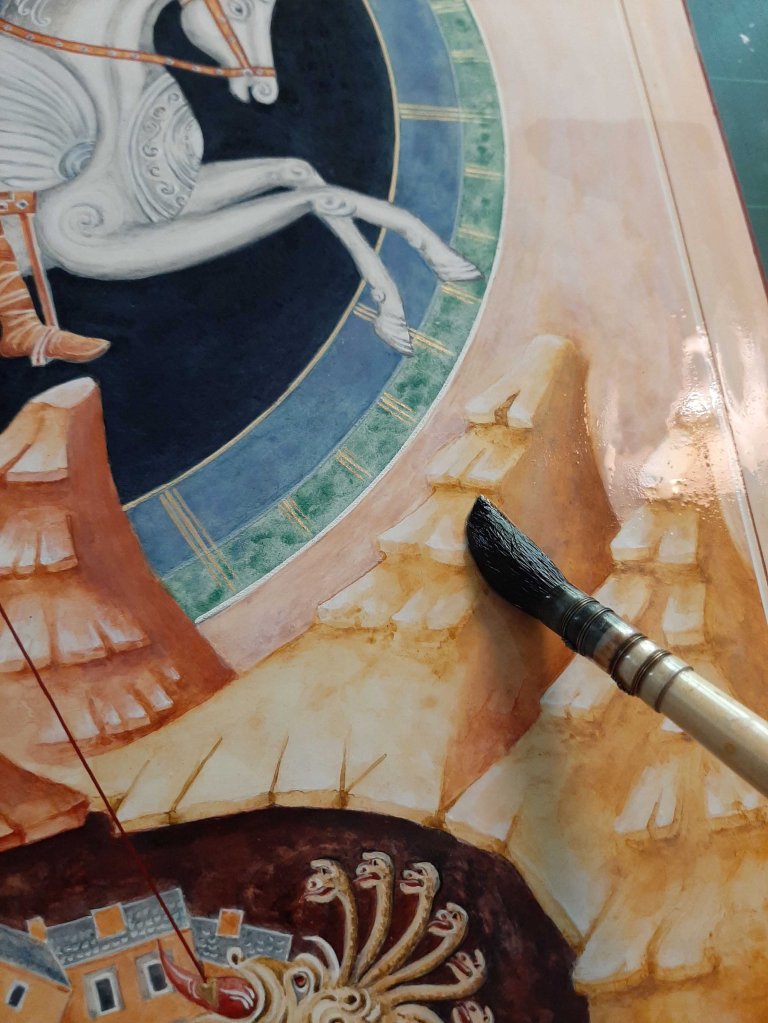 After gilding, I apply a wash of dilute egg stock (10% egg stock 90% water) to seal the gesso using a squirrel mop brush. This offers an even surface for painting over. I apply these thin coats throughout the process – usually when I’m wrapping up the day’s painting session.