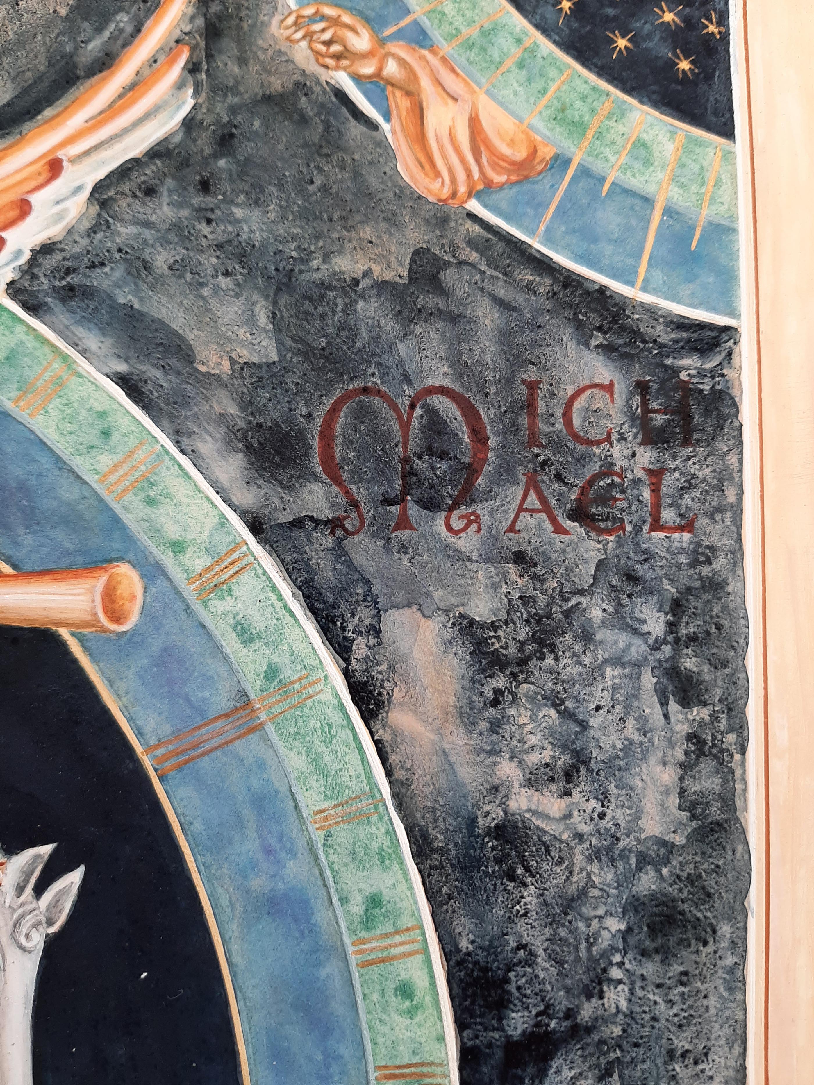 In the meantime, I had made a decision to extend the dark skies beyond the circle to balance the mountain area. The beauty of well-tempered paint is that it forms quite a hard surface after a year or so. With the dilute egg glaze acting as an isolating layer, I could easily remove the new paint if it didn’t look right. I had also decided to firm up the border in a deep red ochre.