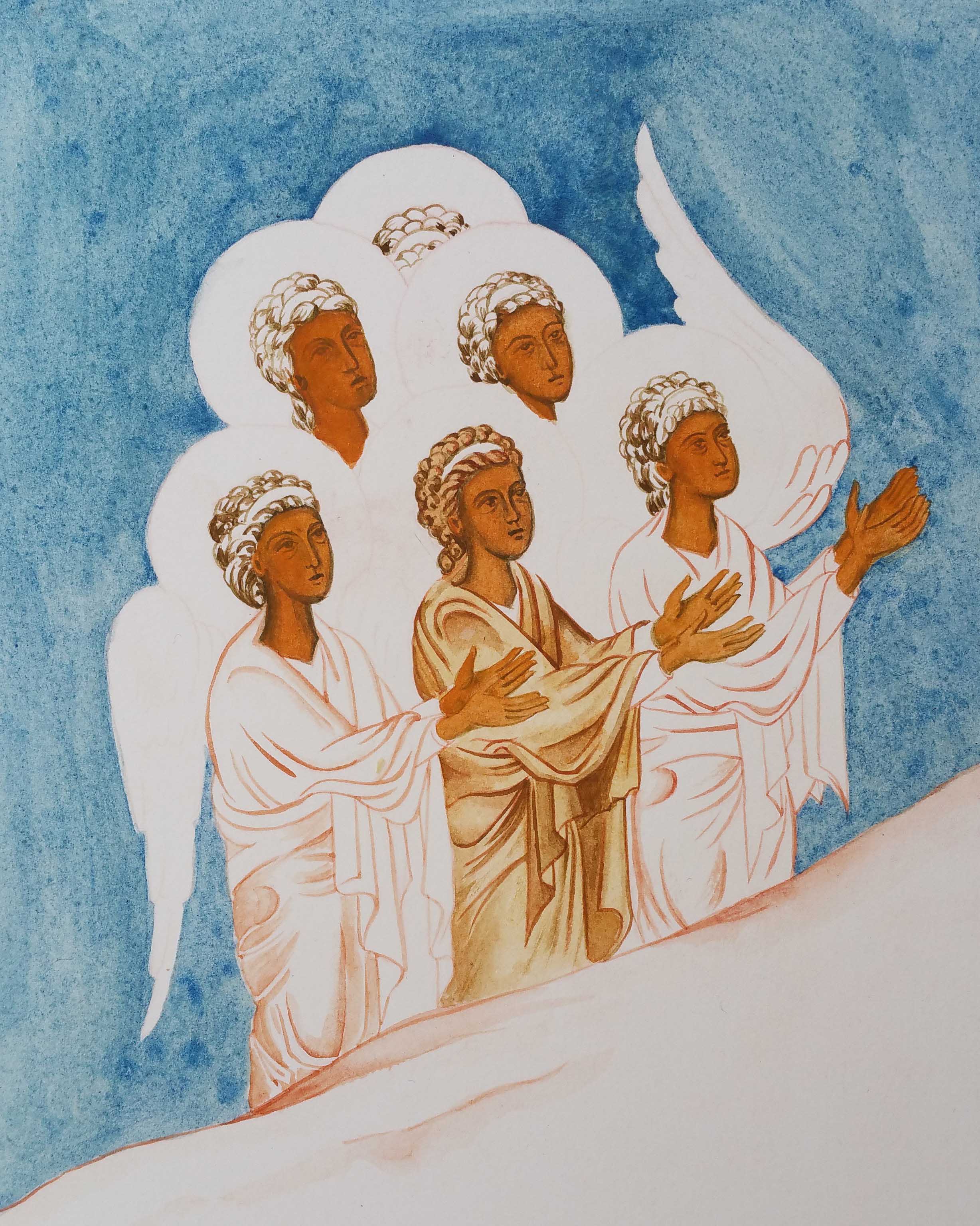 The orchard is cloaked in darkness as I write and there’s a mid-winter owl hooting outside our window. There’s something magical about this time of year. For many, this is the busiest, most hectic time of year so I only want to share a few photos of the stages of painting this cluster of angels on paper.