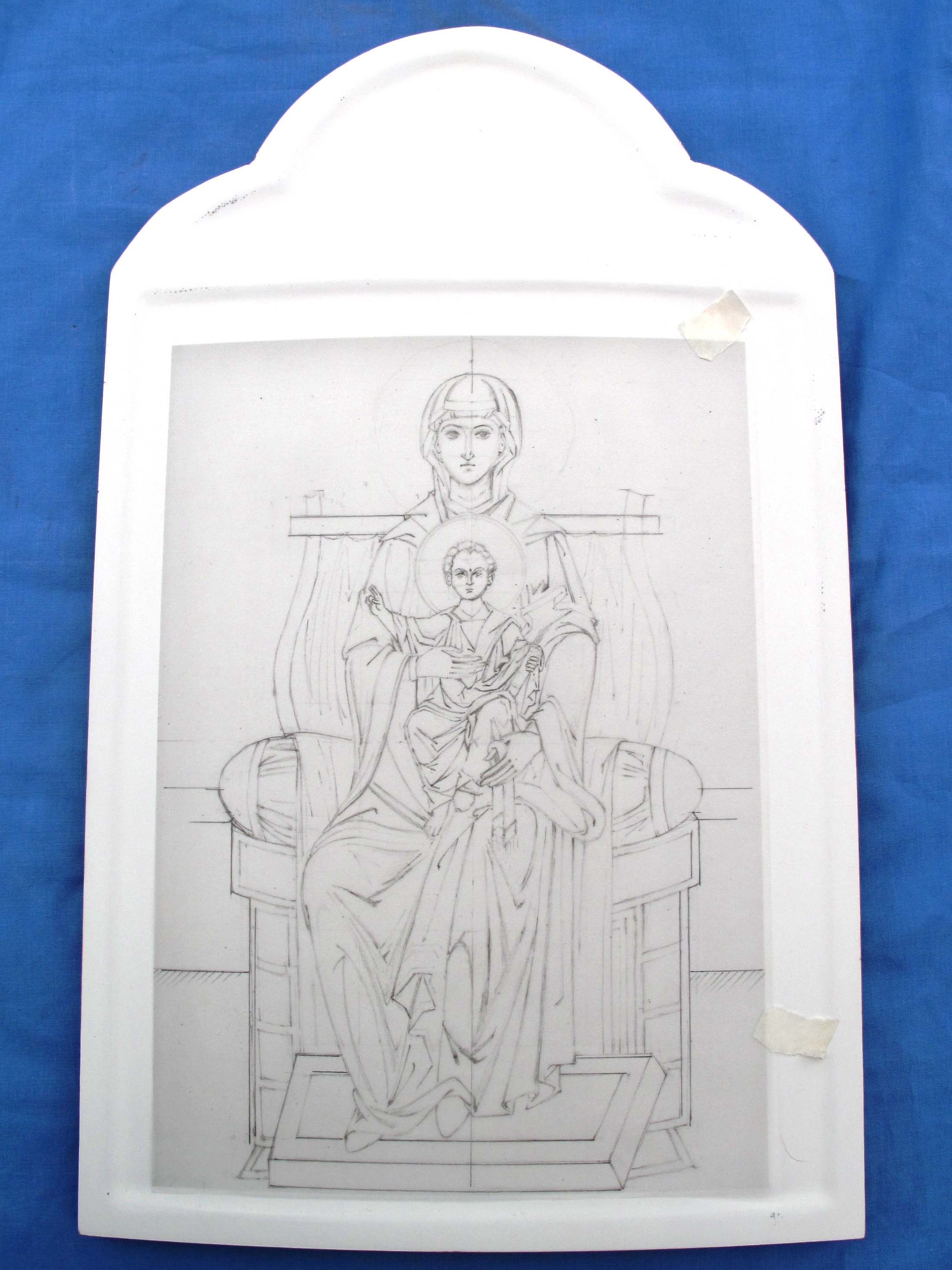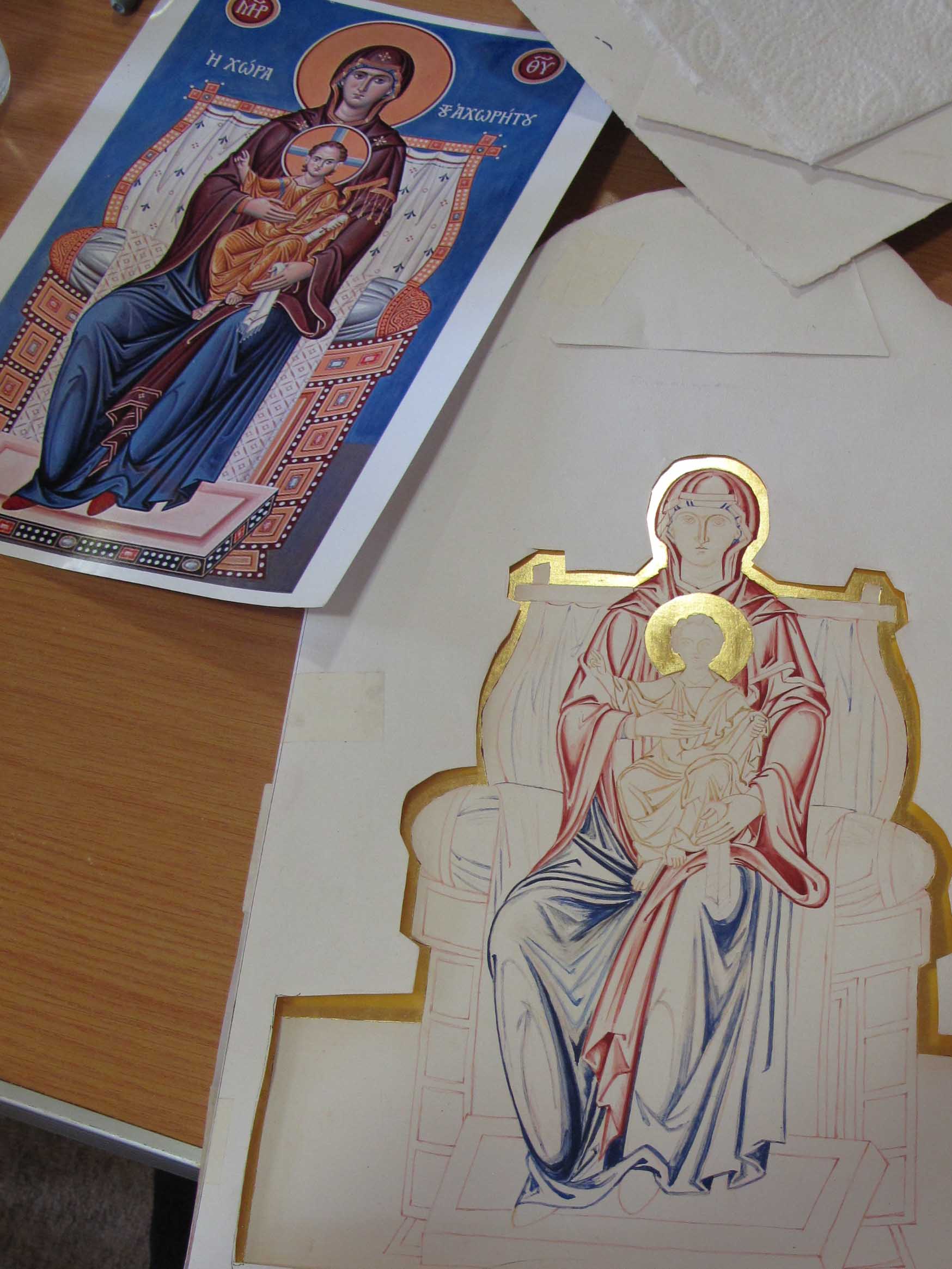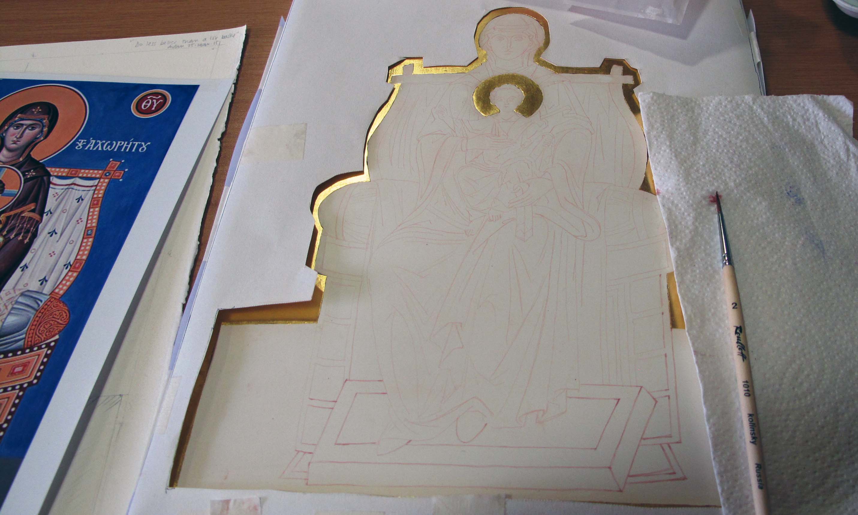 The underpainting of the Christ Child is in English Yellow Ochre with a little Red Ochre added to model the form. The colours are painted quite densely as the garments will be gilded using shell gold assist. I understand from my class mate Lee that for the crispest, most gleaming gold lines, hand-made shell gold is the way to go – thanks Lee! Watch this space for adventures in making shell gold – I rang Wrights of Lymm for a couple of books of gold today!