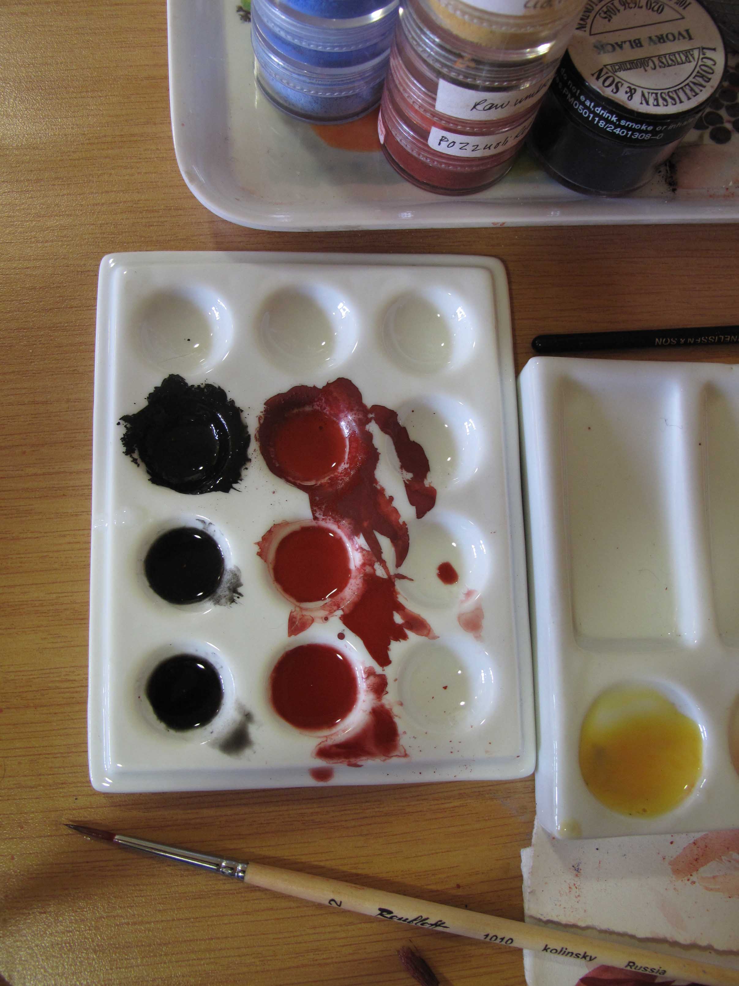 Both pigments are very strong so I mixed them up separately first, then blended. For the underpainting I used a lovely size 2 Roubloff 1010 kolinsky sable brush which I had recently ordered from Vesta-k. It has a really sharp point and holds the pigment well.