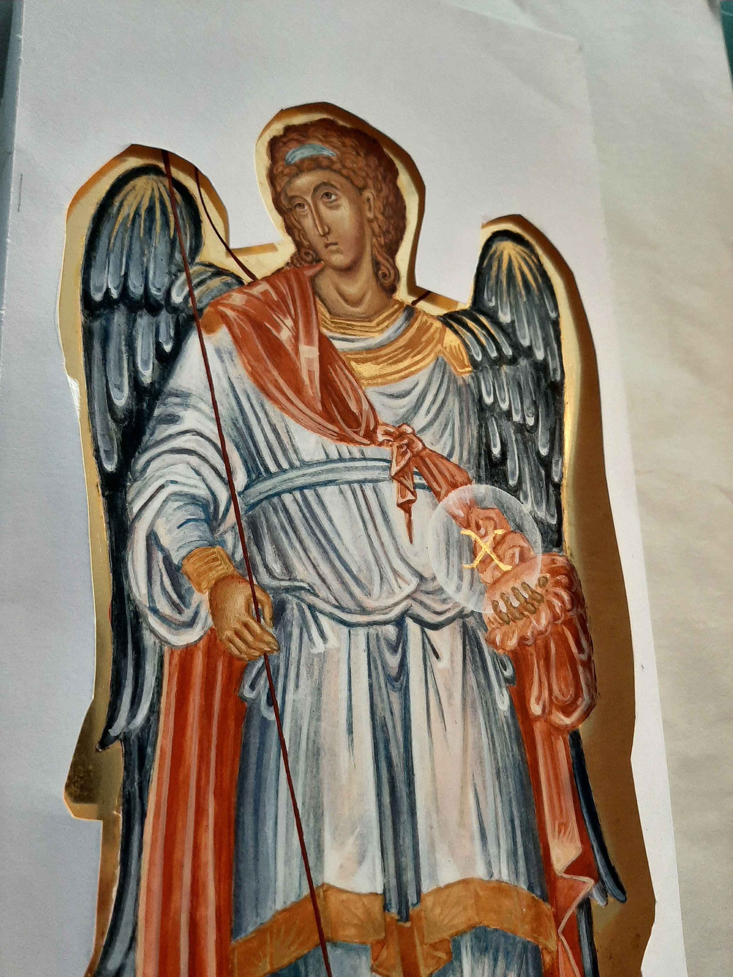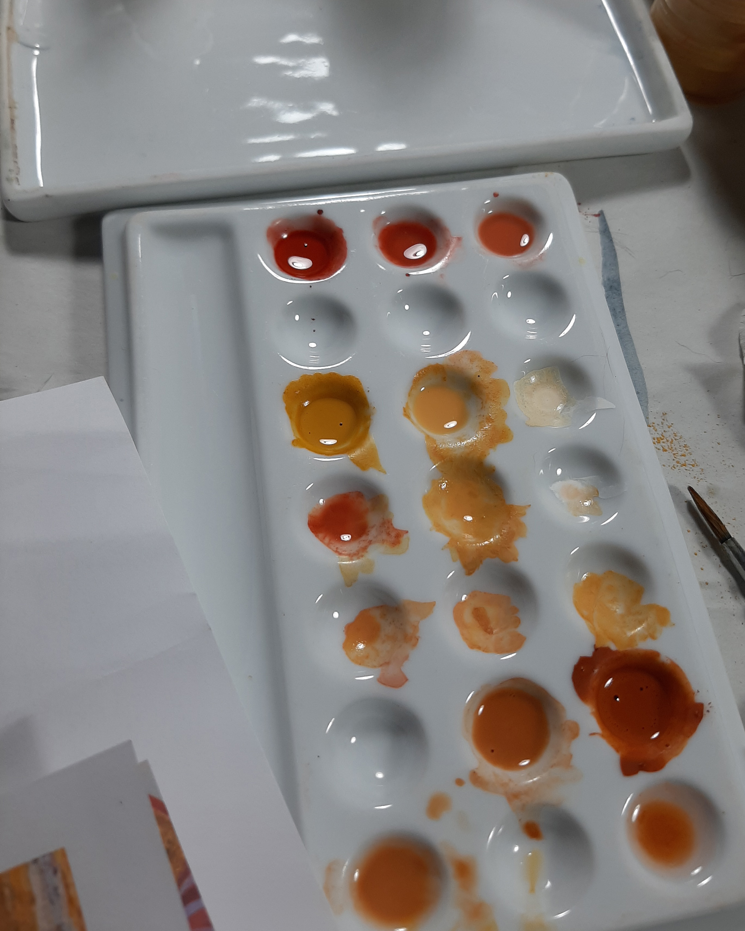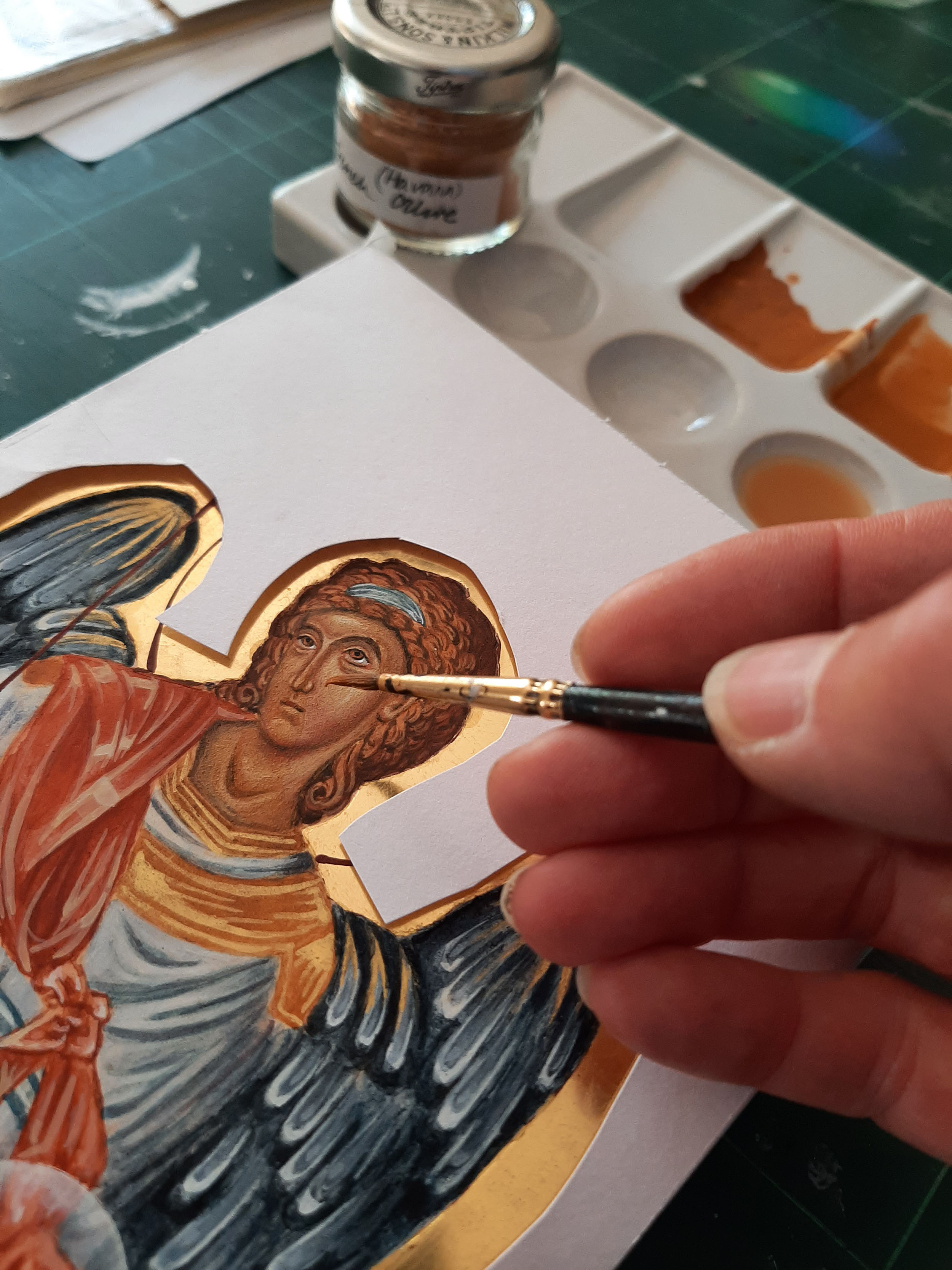 Start by mixing plenty of the golden yellow (you don’t want to run out as it is very hard to remix the same shade). Use a light yellow which brightens gradually by approx. 20% with each layer. Mix yellow ochre light (Maimeri) and a touch of Titanium White. Paint sample swatches to see the contrasts as you want to avoid a big change such as 50%. The photo below shows me trying to find the 20% difference – I will keep trying! It might also help to use a palette with bigger dimples but this was for a different smaller icon.