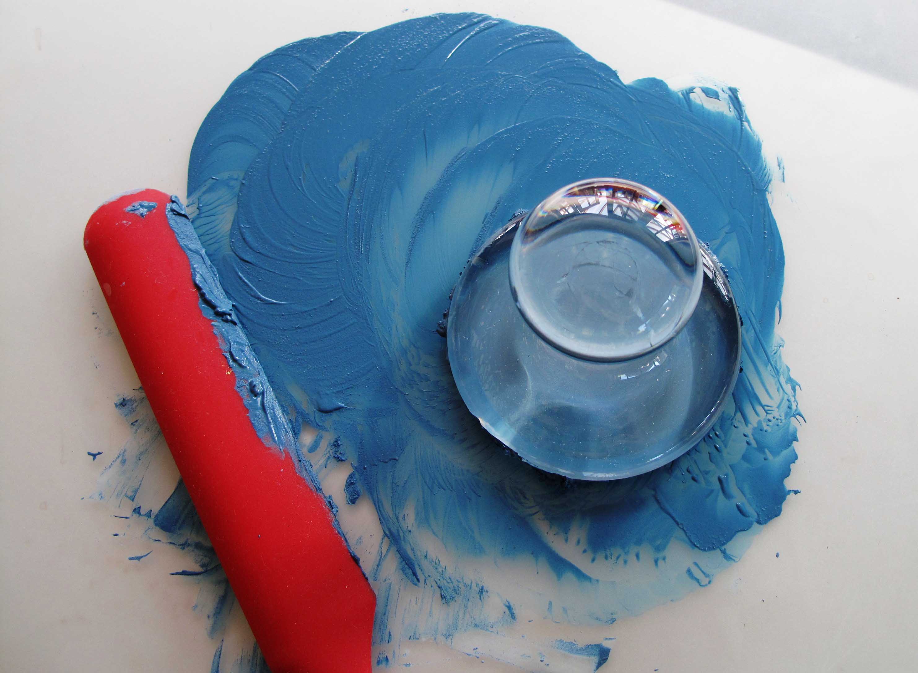 I placed about a tablespoon of pre-ground up pigment on to the slab and added just enough water to make a paste then ground it up, clockwise and anti clockwise, scraping the pigment back into the middle until the paste glides smoothly under the muller.