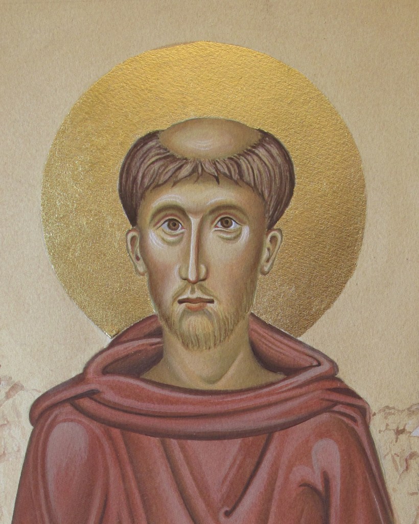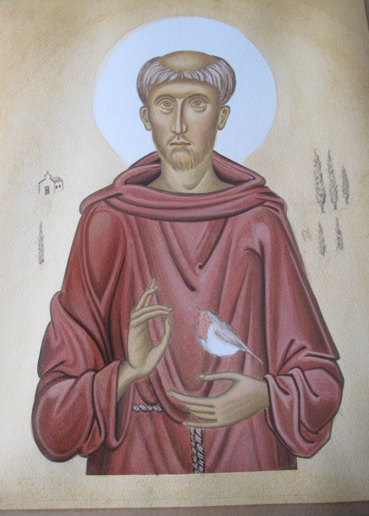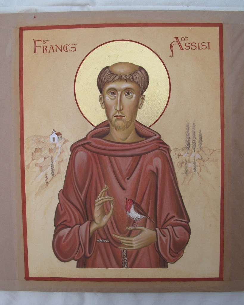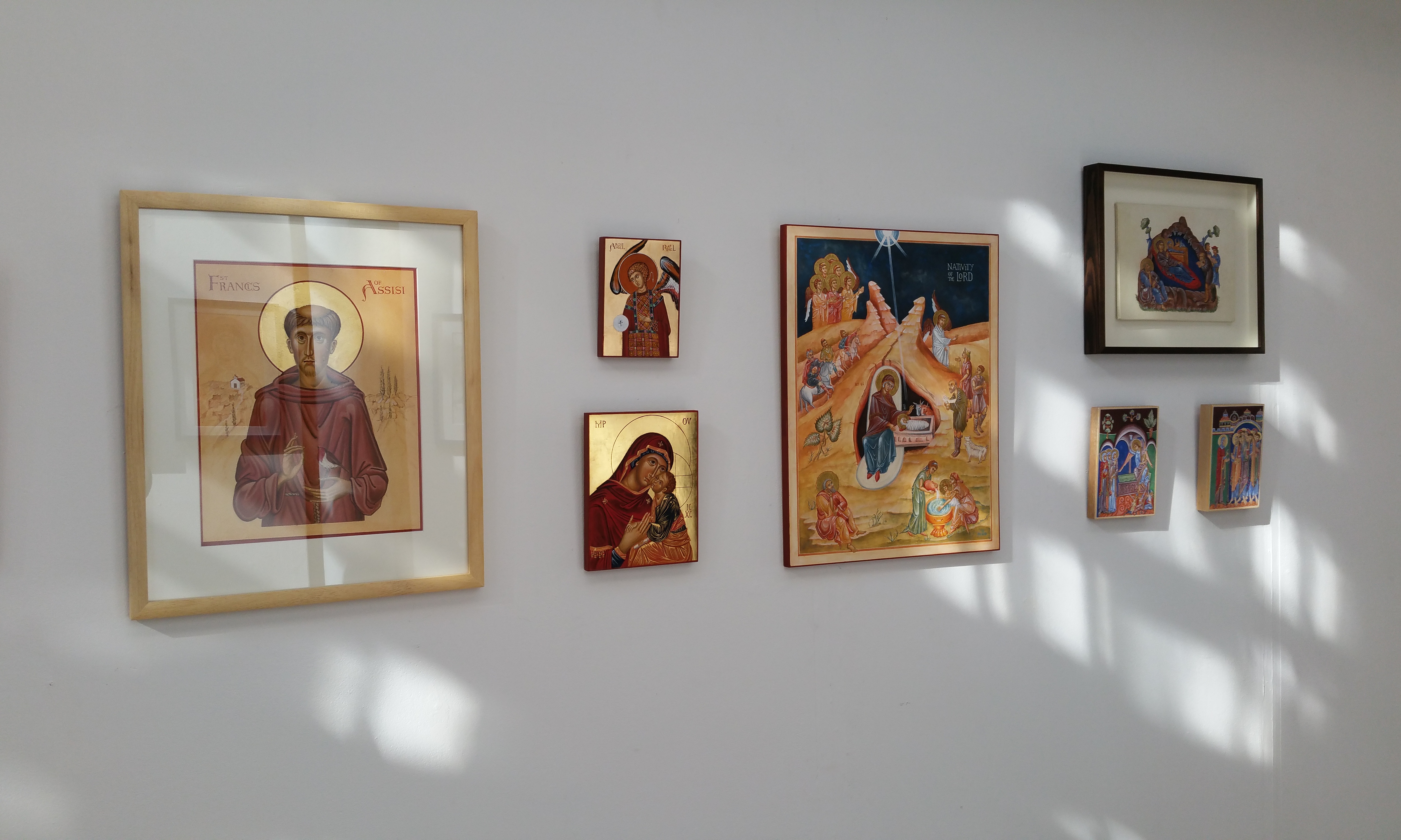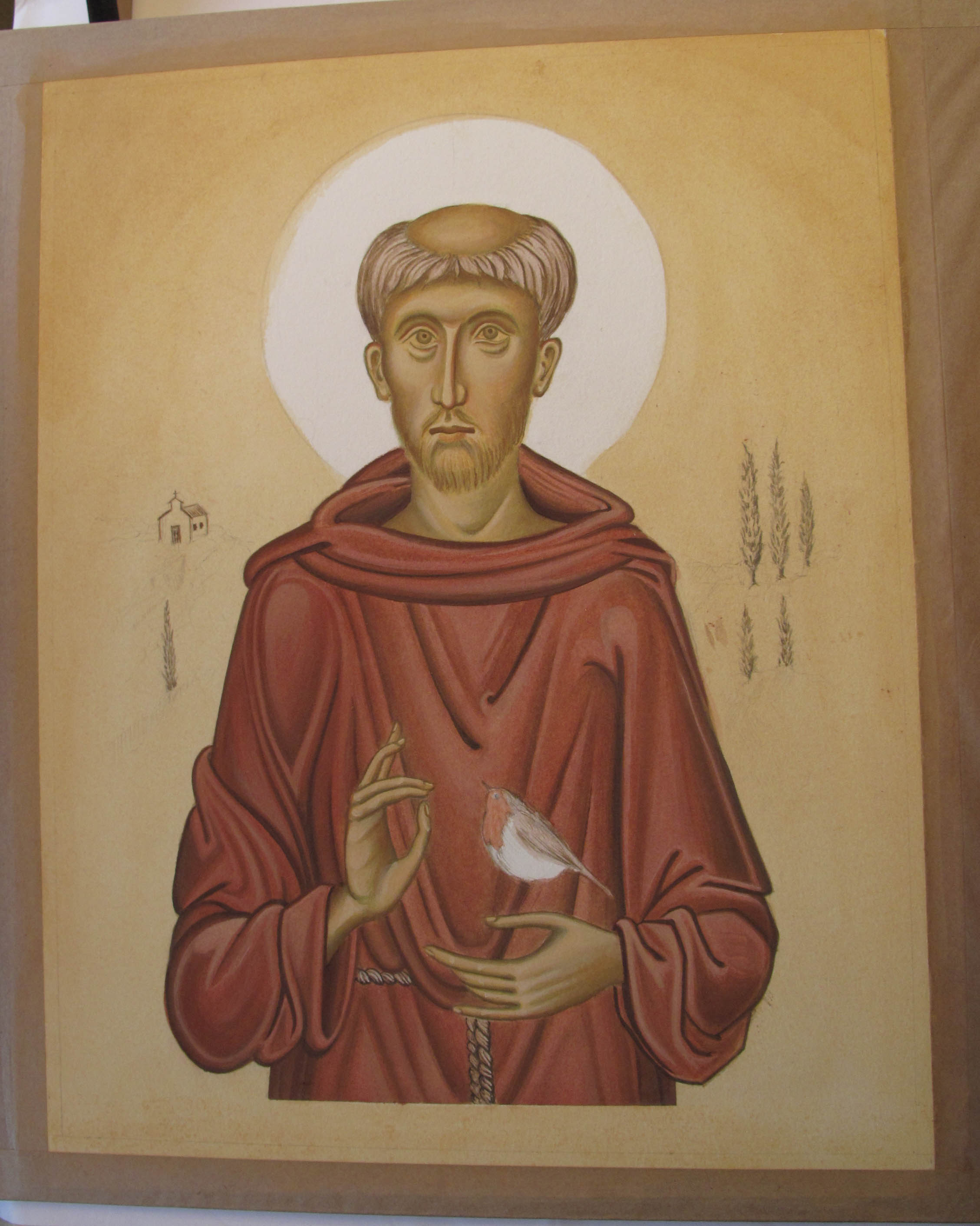 Start by mixing plenty of the golden yellow (you don’t want to run out as it is very hard to remix the same shade). Use a light yellow which brightens gradually by approx. 20% with each layer. Mix yellow ochre light (Maimeri) and a touch of Titanium White. Paint sample swatches to see the contrasts as you want to avoid a big change such as 50%. The photo below shows me trying to find the 20% difference – I will keep trying! It might also help to use a palette with bigger dimples but this was for a different smaller icon.